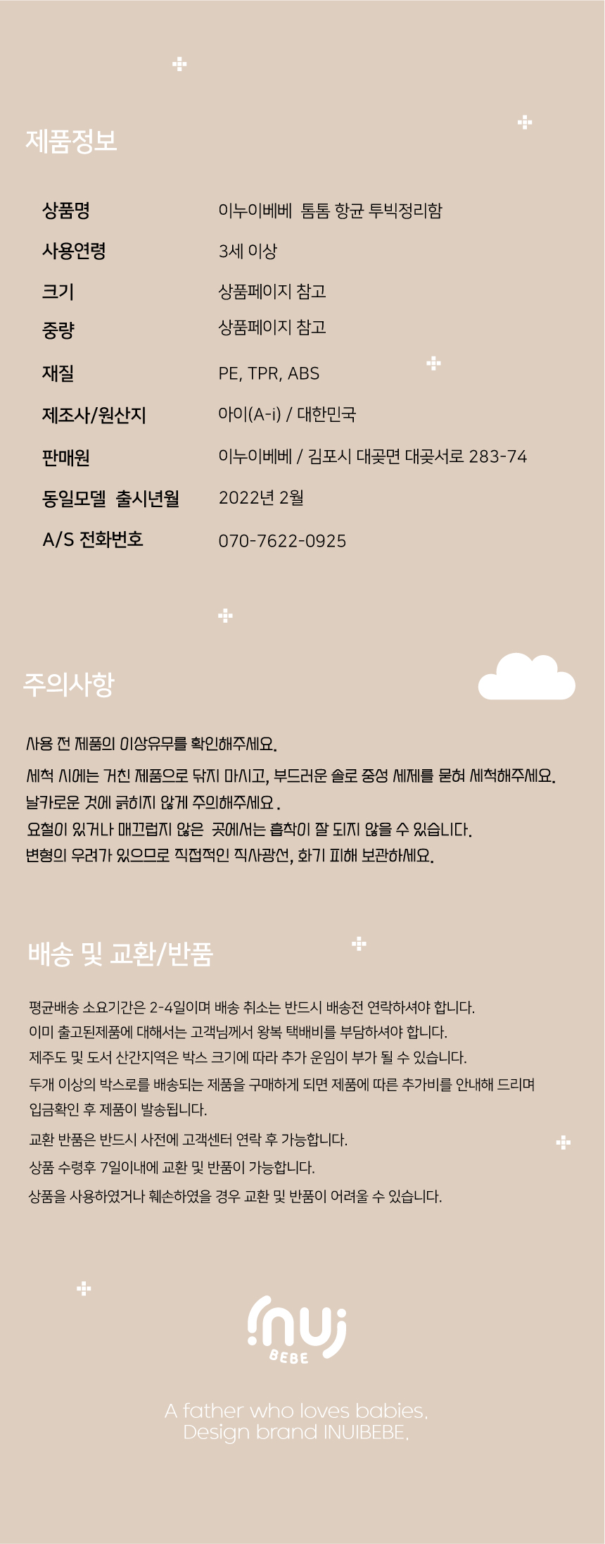 - 상품설명서에 기재한 이외의 상품정보는 이누이베베 고객센터나 스토어 톡톡 문의 등을 통하여 문의하여 주시기 바랍니다.